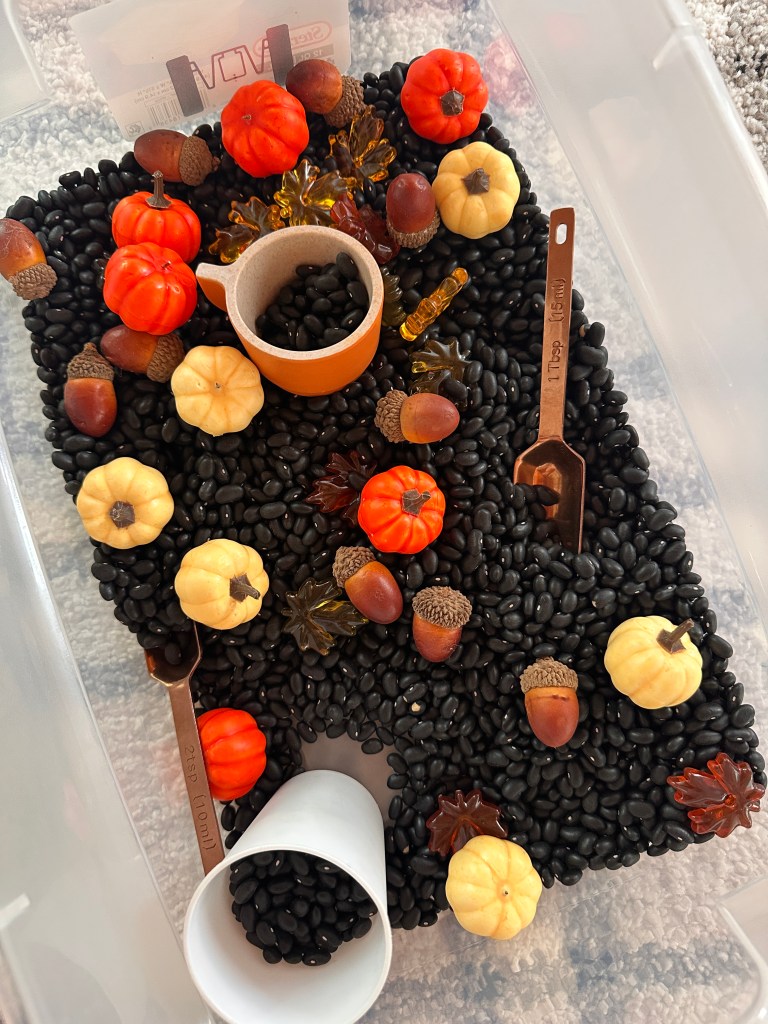 So next time you’re at the dollar store or grocery store, grab a few supplies and create your own cozy fall sensory bin. I promise your little ones will love it!