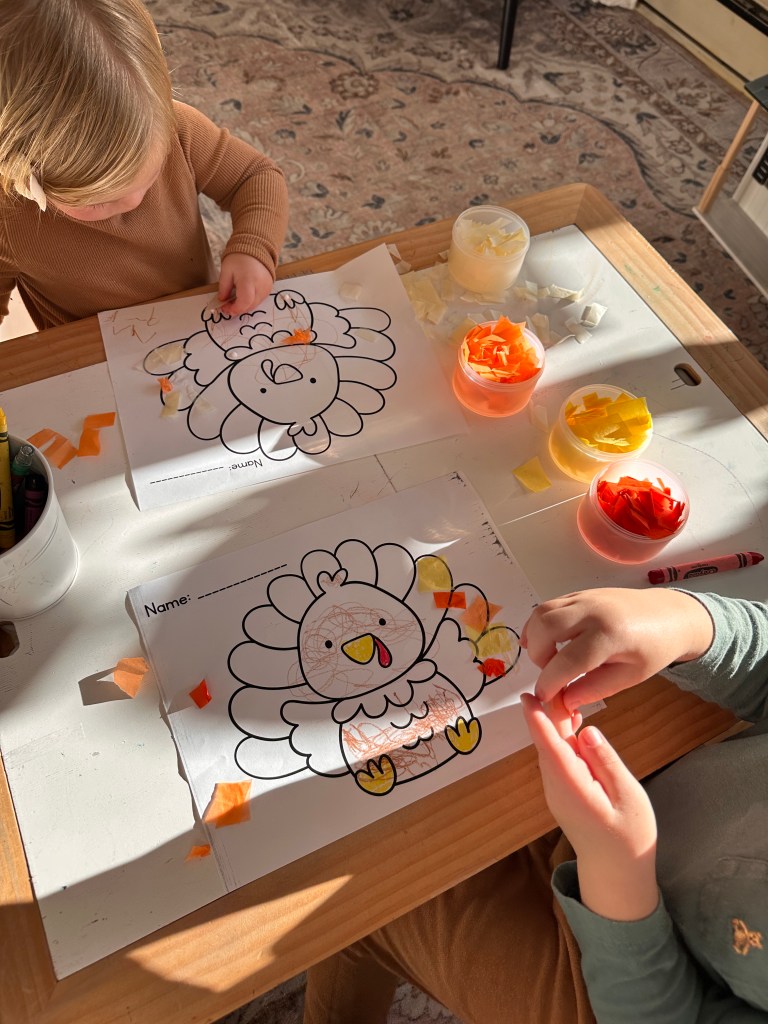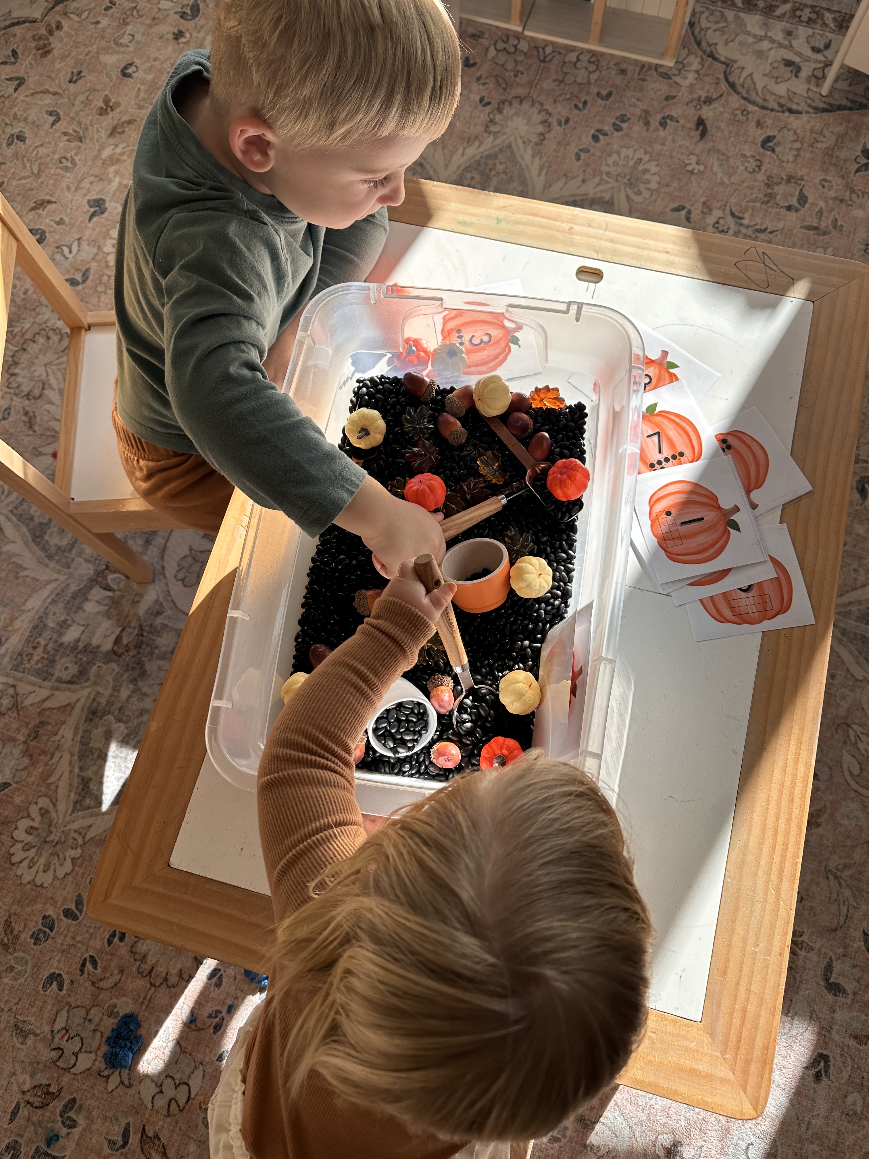 We also love using fall coloring pages and dot painting sheets alongside our sensory bin. It’s the perfect mix of hands-on play and quiet creative time.
